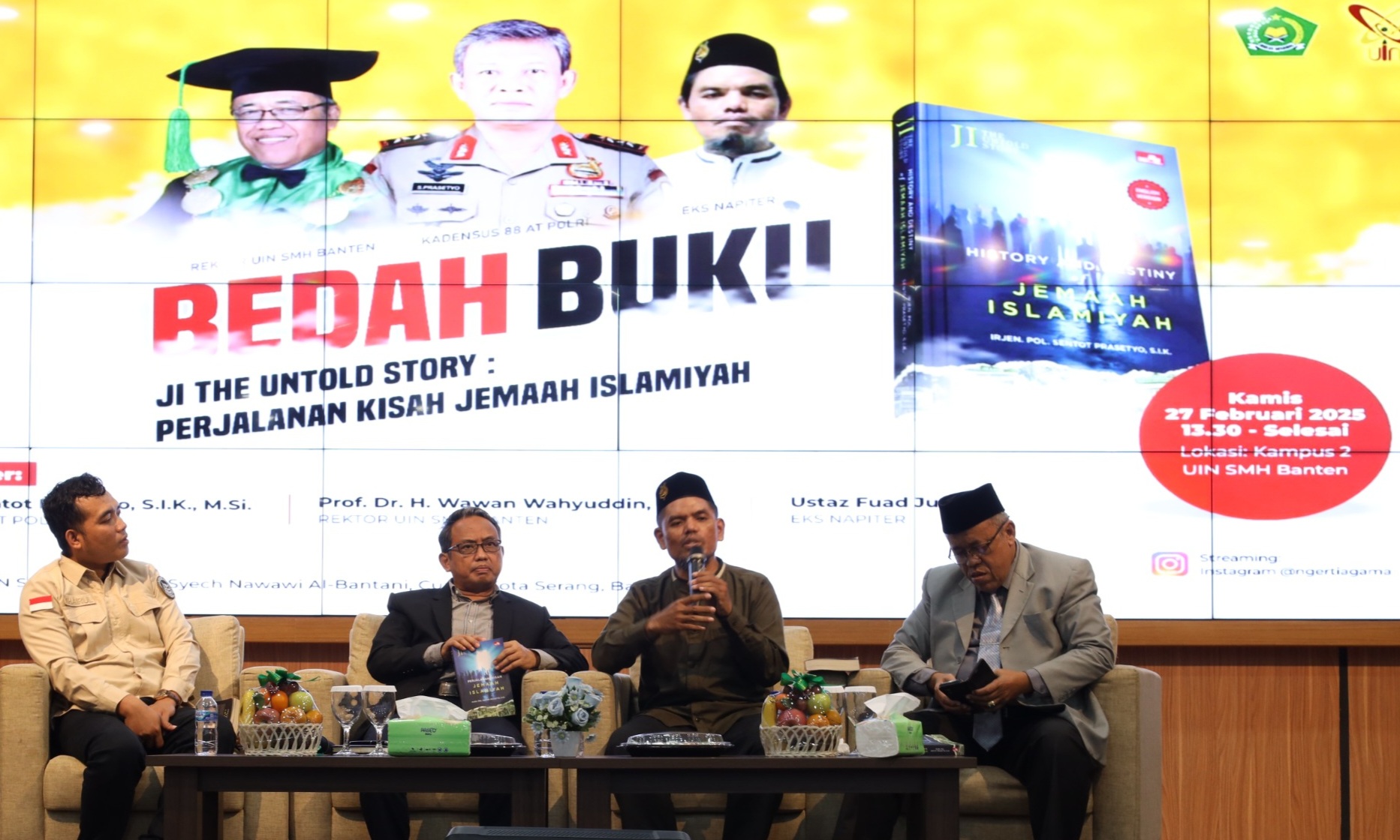 Densus 88 Anti Teror Polri menggelar acara Bedah Buku “JI The Untold Story: Perjalanan Kisah Jemaah Islamiyah” yang ditulis oleh Kepala Densus 88 Anti Teror Polri Irjen. Pol. Sentot Prasetyo, S.I.K., M.Pd.. Acara ini menjadi ruang diskusi akademik untuk mempelajari pola gerakan radikal-terorisme melalui kisah kelompok Jemaah Islamiyah (JI), bertempat di Universitas Islam Negeri (UIN) Sultan Maulana Hasanuddin Banten pada Kamis (27/02-2025).